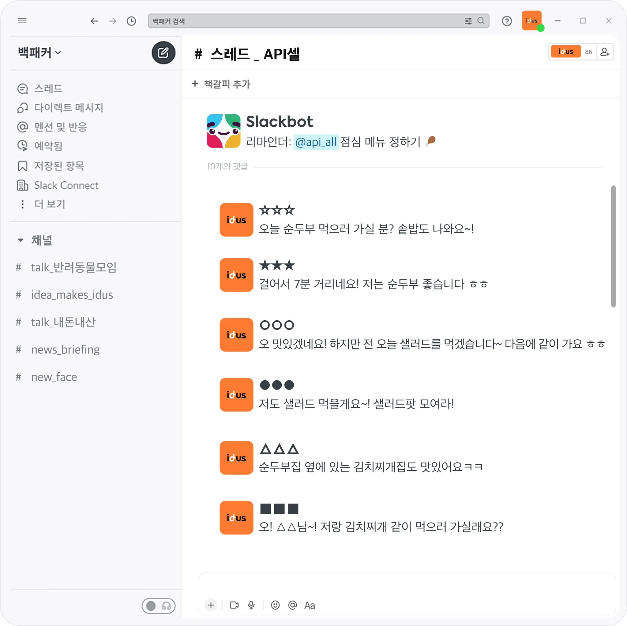 아이디어스팀 구성원들은 Slack에서 열띤 맛집 토론을 벌이기도 하는데요.