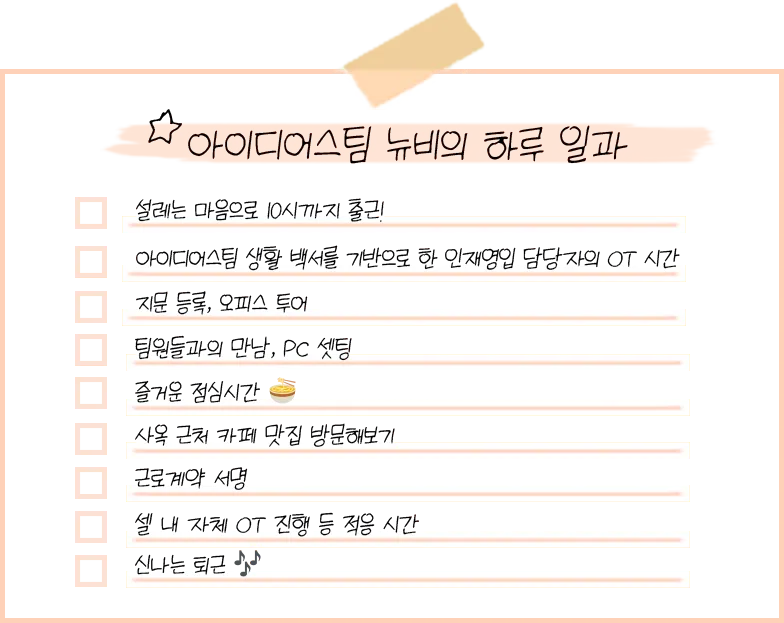 셀 내 자체 OT 및 OJT를 통해 아이디어스팀 적응이 더욱 수월해질 거랍니다~!